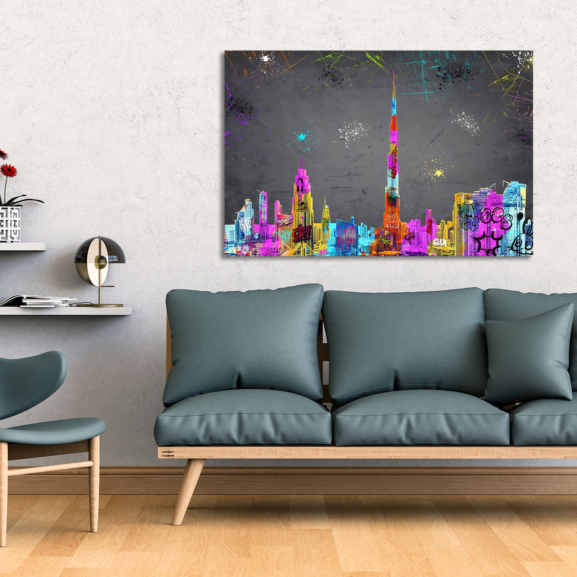 Quadro astratto skyline di Dubai con graffiti e street art