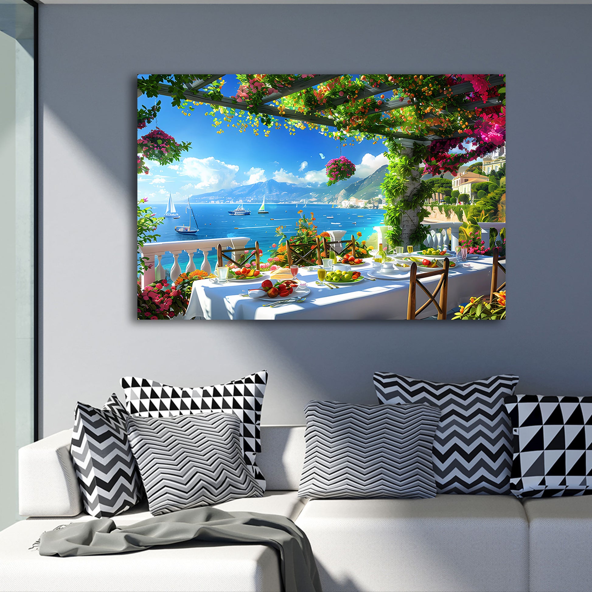 Costiera italiana vista mare con tavola apparecchiata quadro