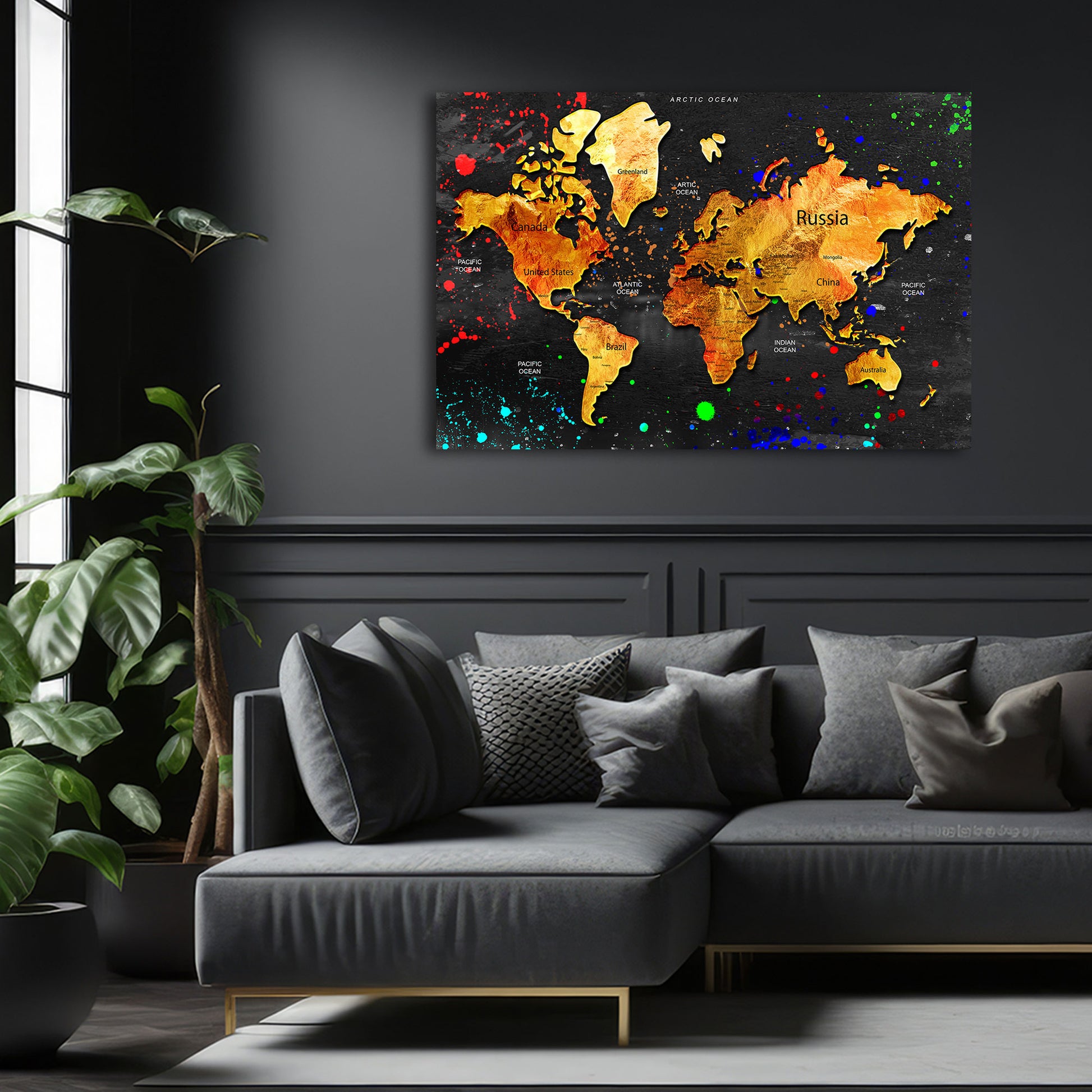 Mappa del mondo oro sfondo nero arte astratta quadro