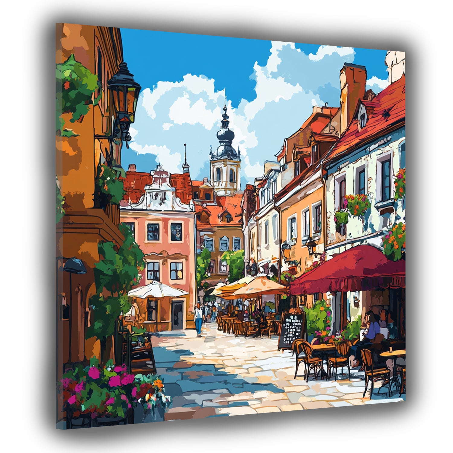 Quadro città centro storico vicolo caffè estate colorato moderno