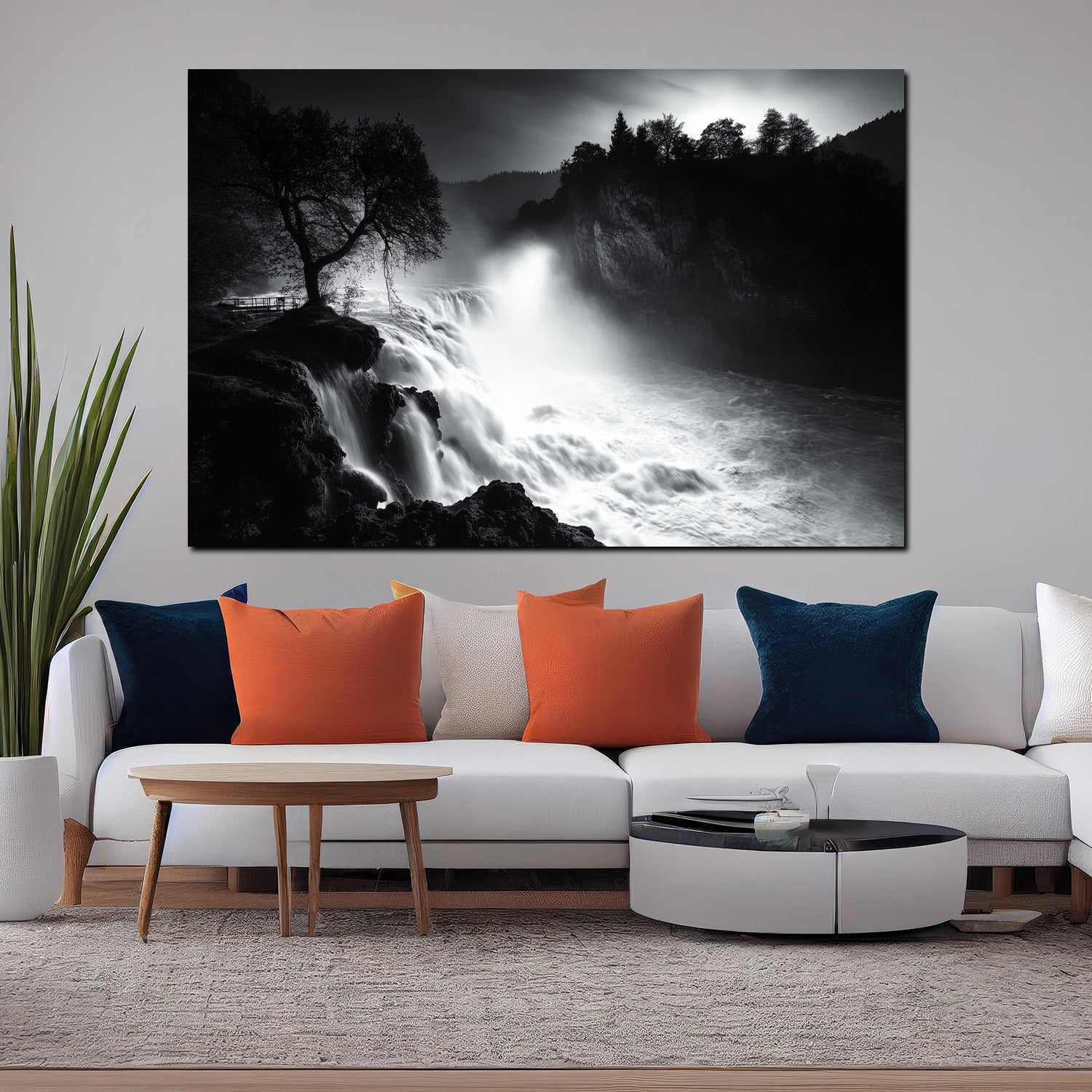 Quadro natura cascata bianco e nero paesaggio forza dell’acqua atmosfera